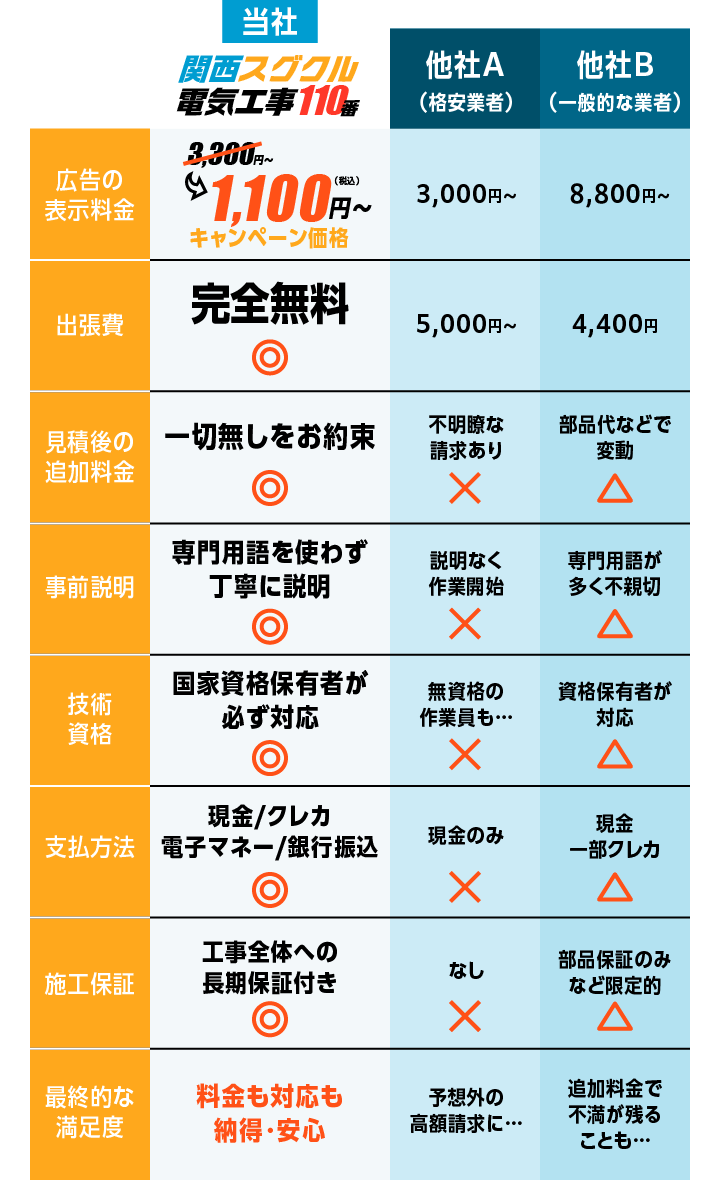 関西スグクル電気工事110 番は、お客様に不要なご心配をおかけしないよう、出張費やお見積り後の追加料金をいただかない明朗会計を徹底しています。